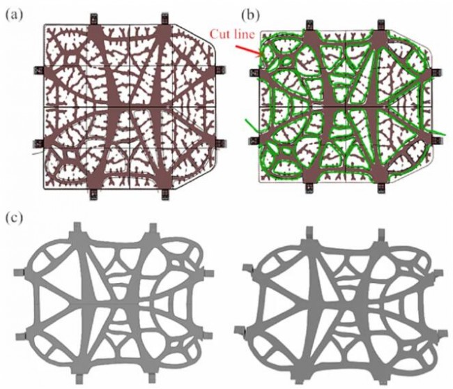 ▲拓撲優化模型的重構:(a)圖像和模型的導入;(b)切割線的劃分;(c)重構效果。