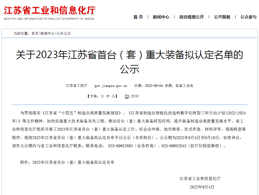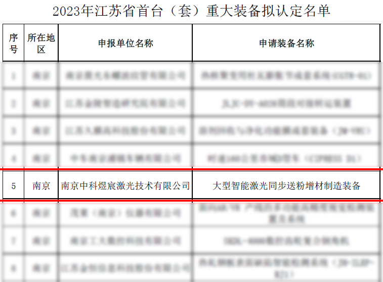 2023年9月4日,江蘇省工信廳對《2023年江蘇省首臺(套)重大裝備擬認定名單》予以公示。中科煜宸的“大型智能激光同步送粉增材制造裝備”被認定為江蘇省首臺套產品。(2018年,中科煜宸LDM8060金屬增材制造裝備獲江蘇省首臺套裝備認定。)