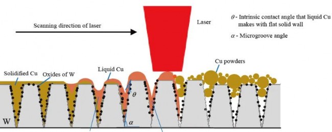 如圖3所示,在激光織構化鎢表面增材制造銅過程中,一方面,表面微納結構改善高溫下液態銅在鎢表面的潤濕性;另一方面,高深徑比溝槽結構還可以提高液態銅在微結構內部毛細力,促進高溫下液態銅的快速鋪展,有效抑制鎢-銅界面缺陷的同時提高接頭處兩種金屬接觸面積。此外,超快激光改性進一步促進鎢-銅界面元素相互擴散層,增強兩種材料界面結合力。最終,鎢-銅異種金屬界面產生高質量機械互鎖。