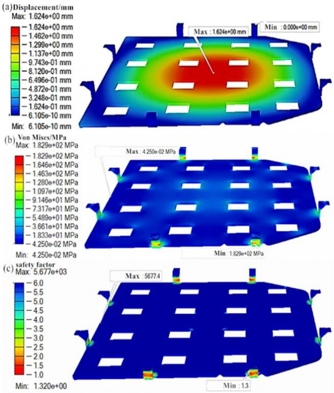 ▲電池載體的受力分析結果:(a)位移云圖;(b)應力云圖;(c)安全系數。