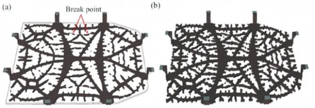基于對拓撲優化后的電池托盤支架結構的進一步分析,托盤支架呈現為樹枝狀形態,枝干相互交織。傳統的逆向重建方法被證明無法取得理想的重建效果。在此研究基礎上,相應地提出了一種基于圖像的逆向重建方法。該方法包括將拓撲優化后的模型導出為圖像,并在其他 3D 軟件中運用切割技術去除枝干,保留主干。這種方法以實現拓撲優化模型的可加工性,并在必要時允許重新設計。