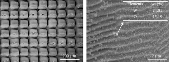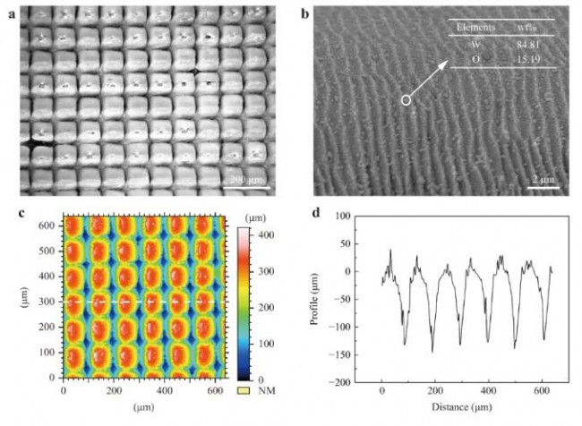 ▲飛秒激光紋理W 的表面形貌:a W 表面和 b 微槽側壁的 SEM 圖像。c W 表面的 3D 形貌和 d 沿 c 中白線的深度輪廓。