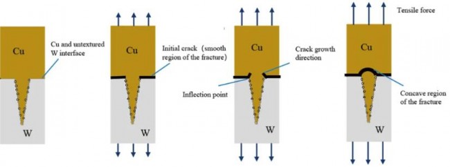 鎢-銅異種金屬斷裂機理示意圖如圖4所示,縱向拉伸變形時裂紋起源于未激光織構化鎢與增材制造銅的接觸表面,加載力增大后,裂紋進一步擴展至嵌入鎢內部的銅,實驗數據表明接頭拉伸斷裂強度接近擴散焊接鎢-銅接頭。值得注意的是,互鎖接頭力學性能可以通過優化鎢表面結構以及界面銅增材制造工藝獲得進一步提升。
