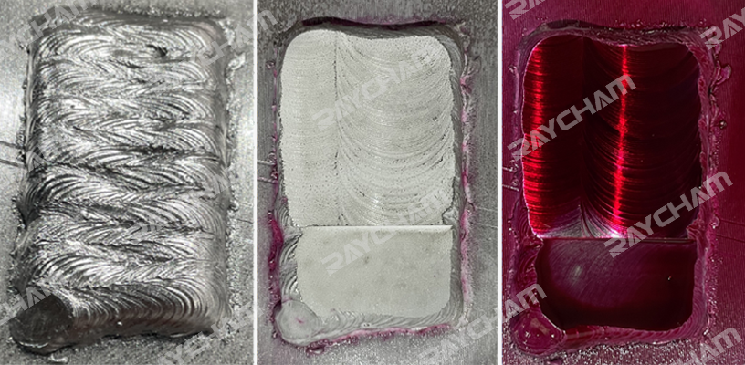 我們對ZM5鎂合金電弧增材樣塊內部進行著色探傷檢測,結果表明鎂合金沉積體內部無氣孔、裂紋、未熔合等缺陷。