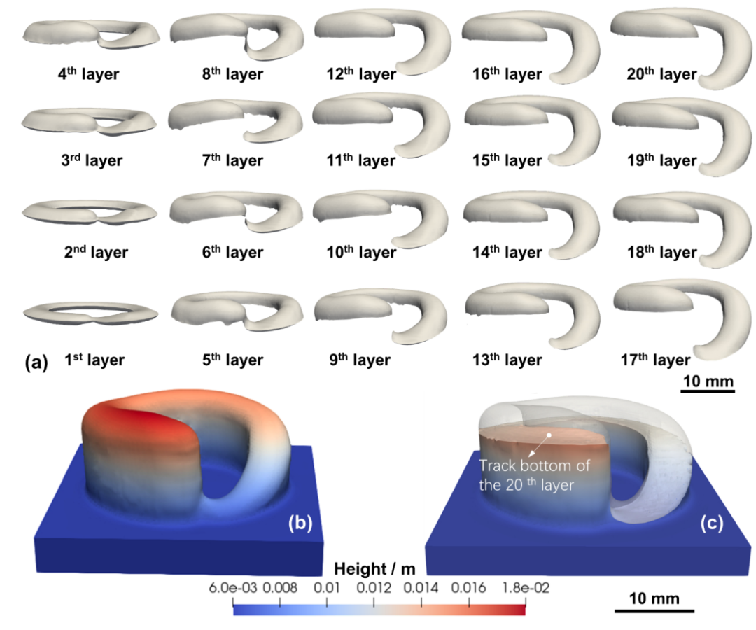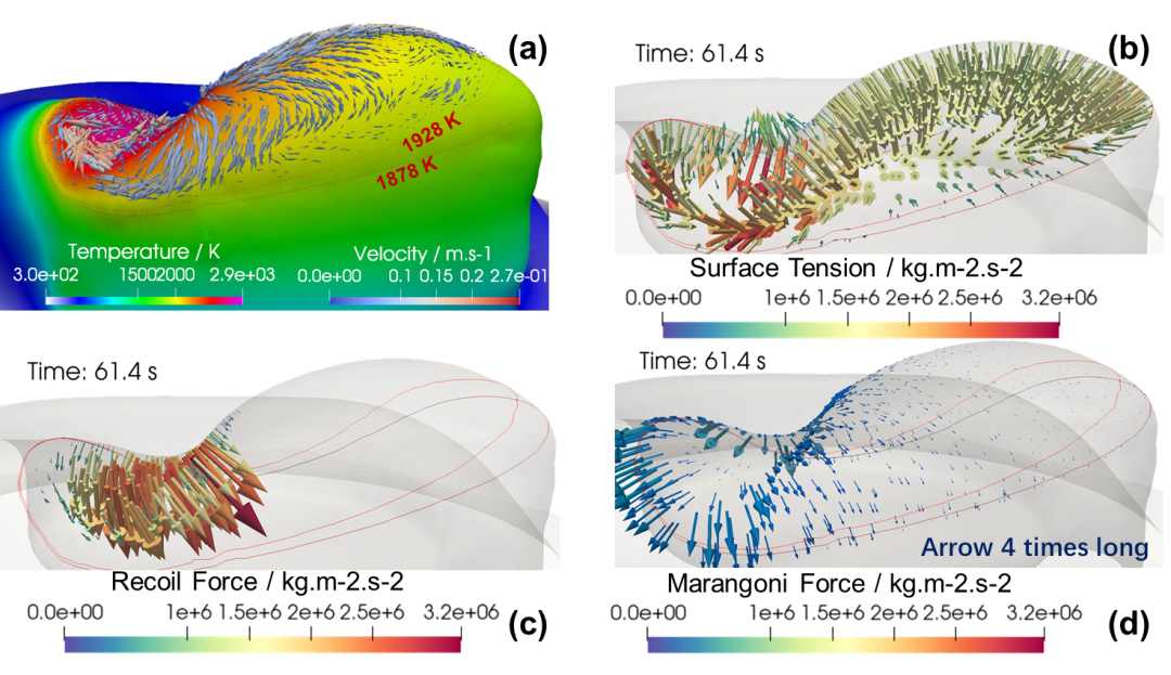 該研究揭示了激光增材制造過(guò)程中熔池內(nèi)部作用力對(duì)沉積偏差的影響機(jī)制,在介觀尺度探明了蒸汽反沖壓力、表面張力、熱毛細(xì)力在不同傳熱條件下對(duì)熔池形態(tài)的具體作用,繼而闡明了封閉路徑結(jié)構(gòu)在掃描路徑處產(chǎn)生偏差的根本原因。